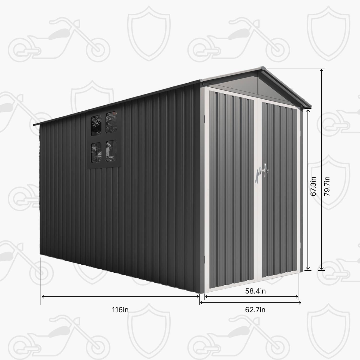 - [Built to Outlast] With 58.4"x116.1"x67.3" interior dimensions, our heavy duty vehicle shed delivers unmatched spaciousness for your bulky motorcycles and tools. Engineered with upgraded 24-gauge galvanized steel panels (0.25mm), this motorcycle storage shed resists corrosion, pests, and harsh weather while requiring near-zero maintenance. A lifetime investment, it outlasts your motorcycle itself—guaranteed to pay for itself over decades of reliable service