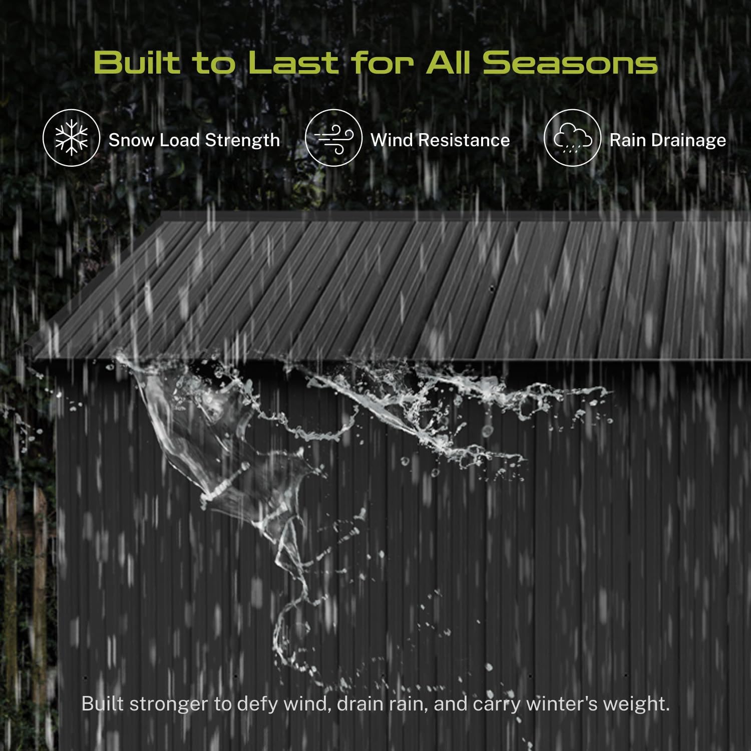- β [Sloped Roof for Superior Weather Protection] Designed for real-world conditions, the efficient sloped roof system guarantees optimal rainwater drainage, preventing damaging pooling and leaks. This key feature in our storage buildings and sheds clearance design minimizes maintenance and ensures your tools, equipment, and belongings stay consistently dry inside