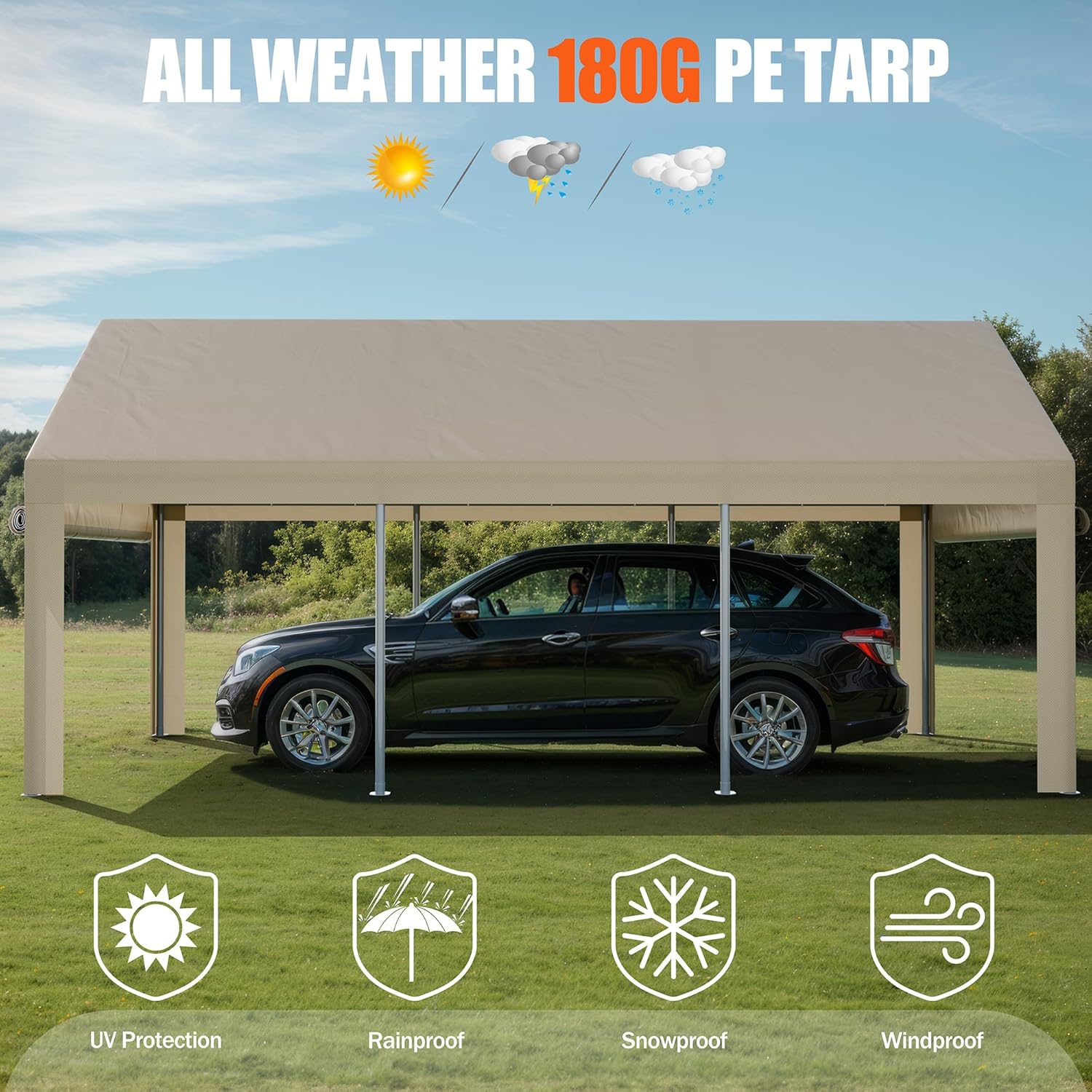 - 【Sturdy & Weatherproof Canopy】Our large Carport is made of a 180g PE tarp and can protect your car or boat against all four seasons elements, like sun, rain, and dust. The canopy cover is firmly fixed on the frame by elastic balls and the support foot has a stable foundation. You can rest assured that your vehicle can be well-protected.