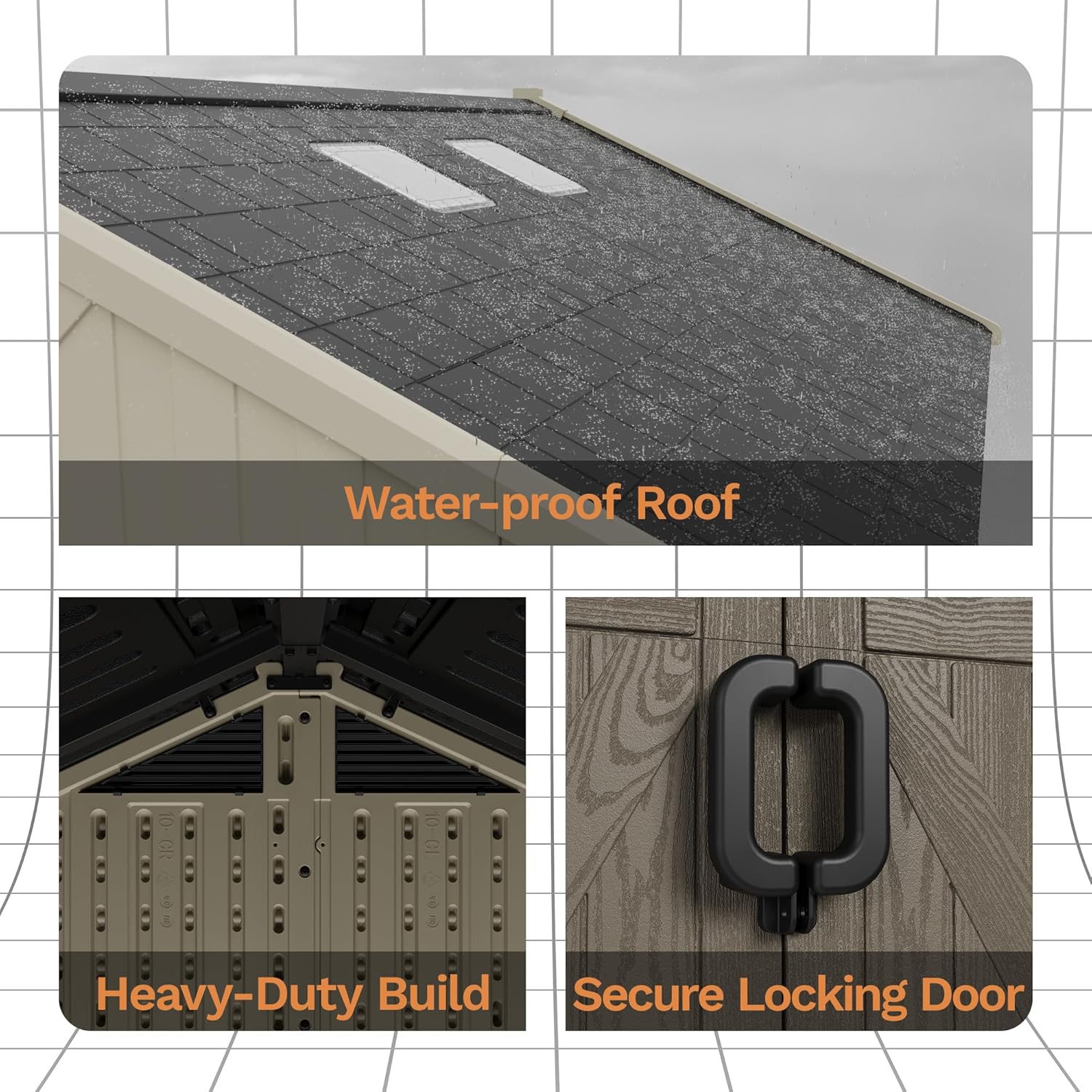 - Large Storage Capacity Space: This resin storage shed with floor is stylish and weather resistant. Large inside provides ample space to hold your mower, ladders, bikes, garden tools, and other lawn care equipment.