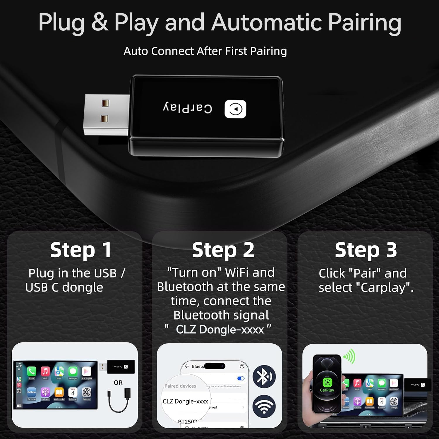 - 【Easy to use】No need for any additional drivers and applications, faster system startup and response, truly plug and play! The first time you use it, you just need 3 simple steps to complete the setup. CarPlay wireless connection is automatically activated every time you start your car, up to 5 times faster than other carplay adapters! (Make sure Bluetooth and Wi-Fi are enabled on your phone.)