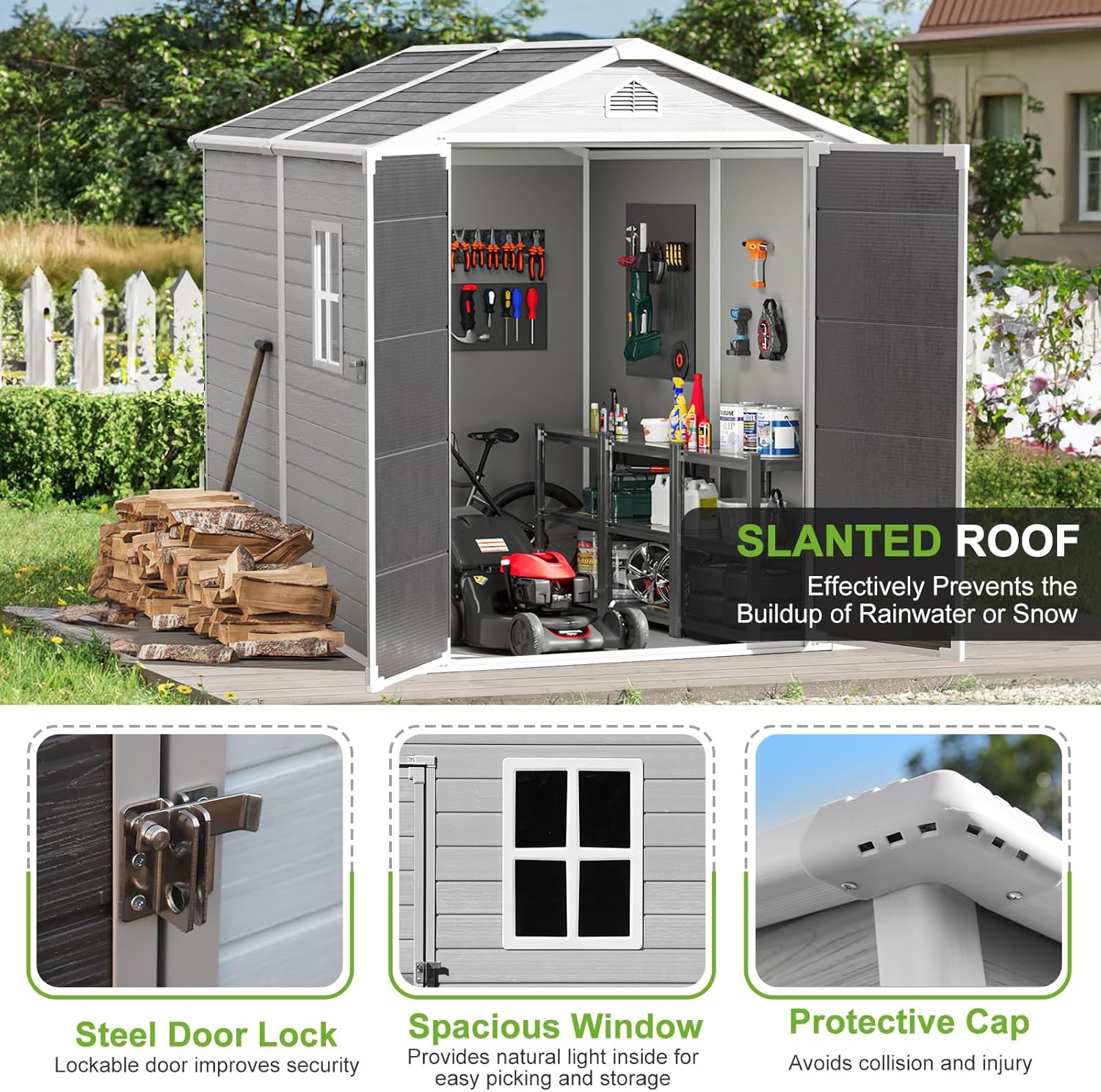 Plastic Sheds 6x8 Shed Resin Outdoor Storage with Floor Included, Waterproof Lockable Garden Tool Storage Cabinet