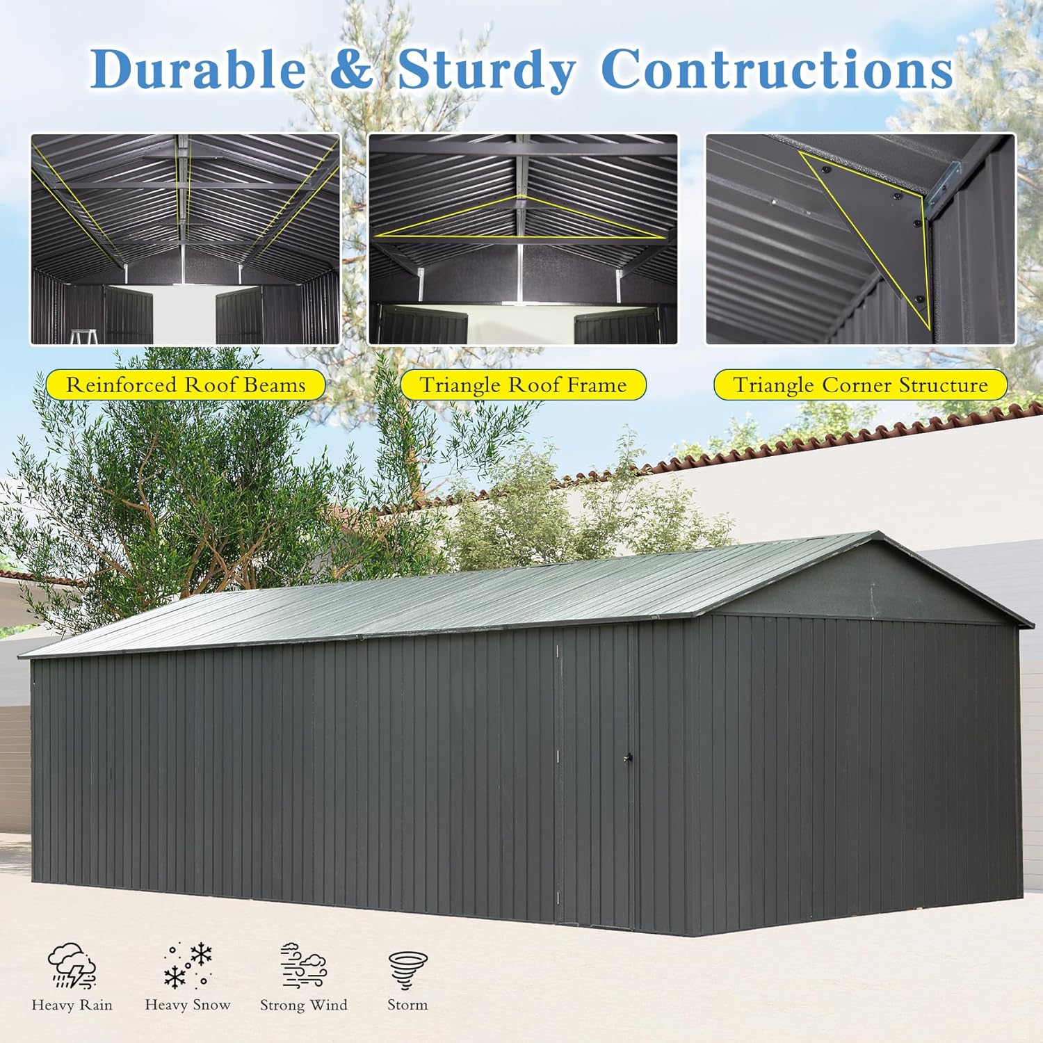 - Extra Large Storage Shed - Available in 15FT, 20FT, and 25FT options, domi storage shed offers a secure and weatherproof space to store cars, trucks, lawn equipment, bicycles, outdoor furniture, and more. It helps declutter your yard, garage, or basement while keeping everything organized and protected.