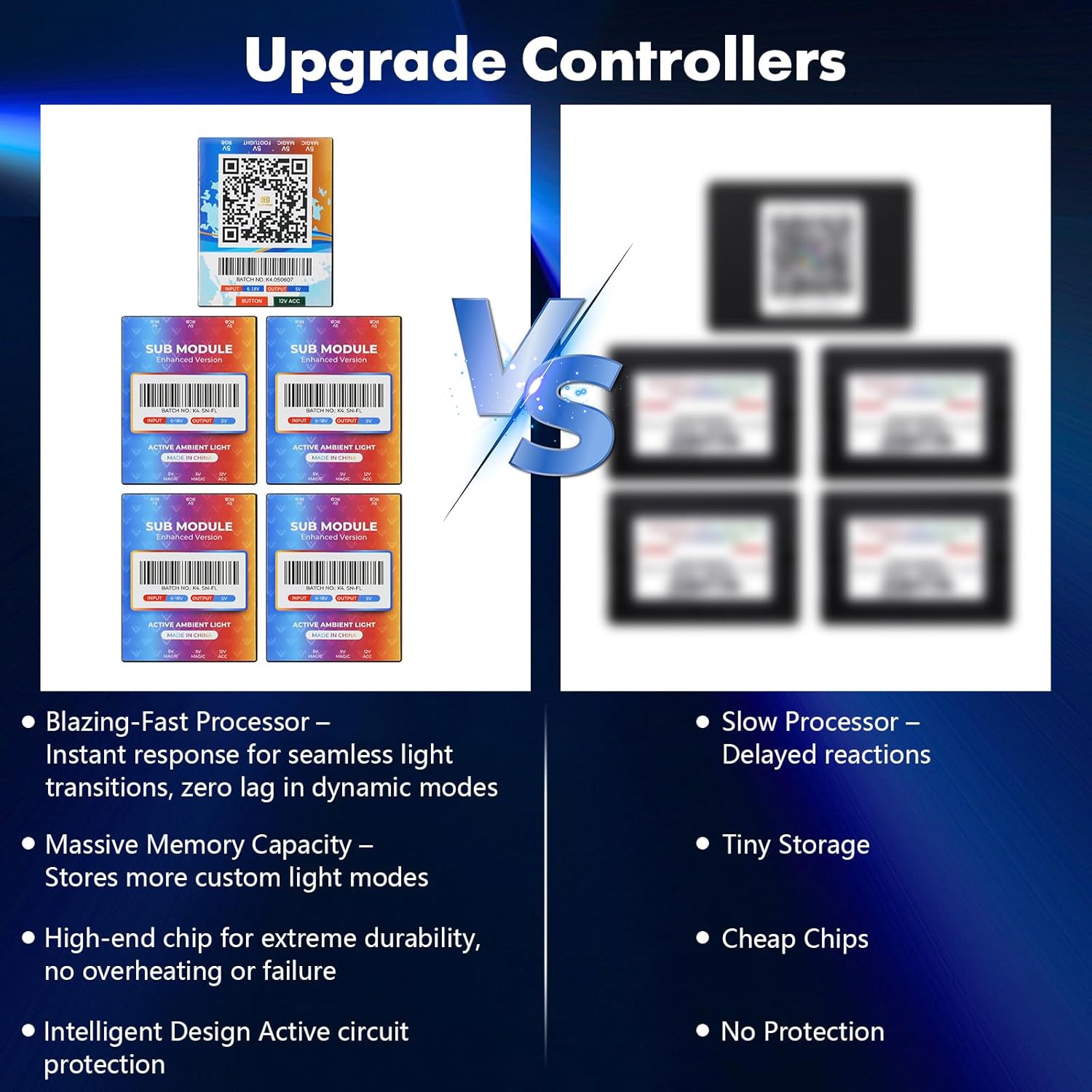 - 🚗 [ Blazing-Fast Dual-Zone Control & Premium Brightness ]Experience instant, lag-free light transitions powered by our high-end chip controller. Uniquely control two ambient lighting car zones separately via our self-developed app: Zone 1 for dash/strips & speakers, Zone 2 for footwells/handles/compartments. Double the high-performance LED beads deliver dramatically brighter, perfectly uniform illumination across your car interior, far surpassing standard led lights for car interior.