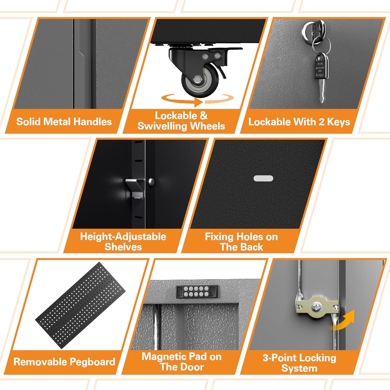 - đ§âđ§ăEffortless Mobility and Easy AssemblyăWith four 360-degree swivel casters that can be locked when not in motion, this garage cabinets with wheels is easy to move around yet stable when needed. The included assembly instructions clearly illustrate each component and step, along with an assembly video for reference, enabling one person to complete the setup in approximately 40 minutes.
