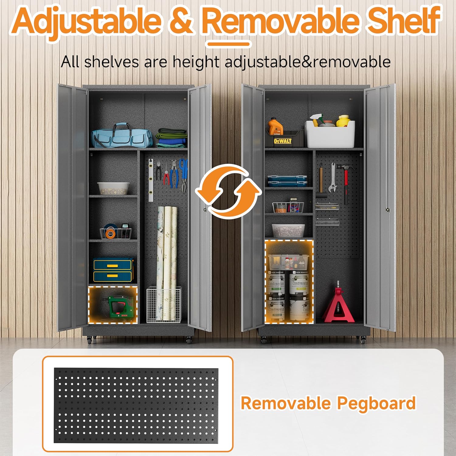 - đ ď¸ăAmple Storage Space with Customizable LayoutăOffering more storage than traditional cabinets, this garage storage cabinet features adjustable and removable shelves to fit tools of any size and a portable pegboard that detaches for on-the-go organization, tailored to your specific needs.