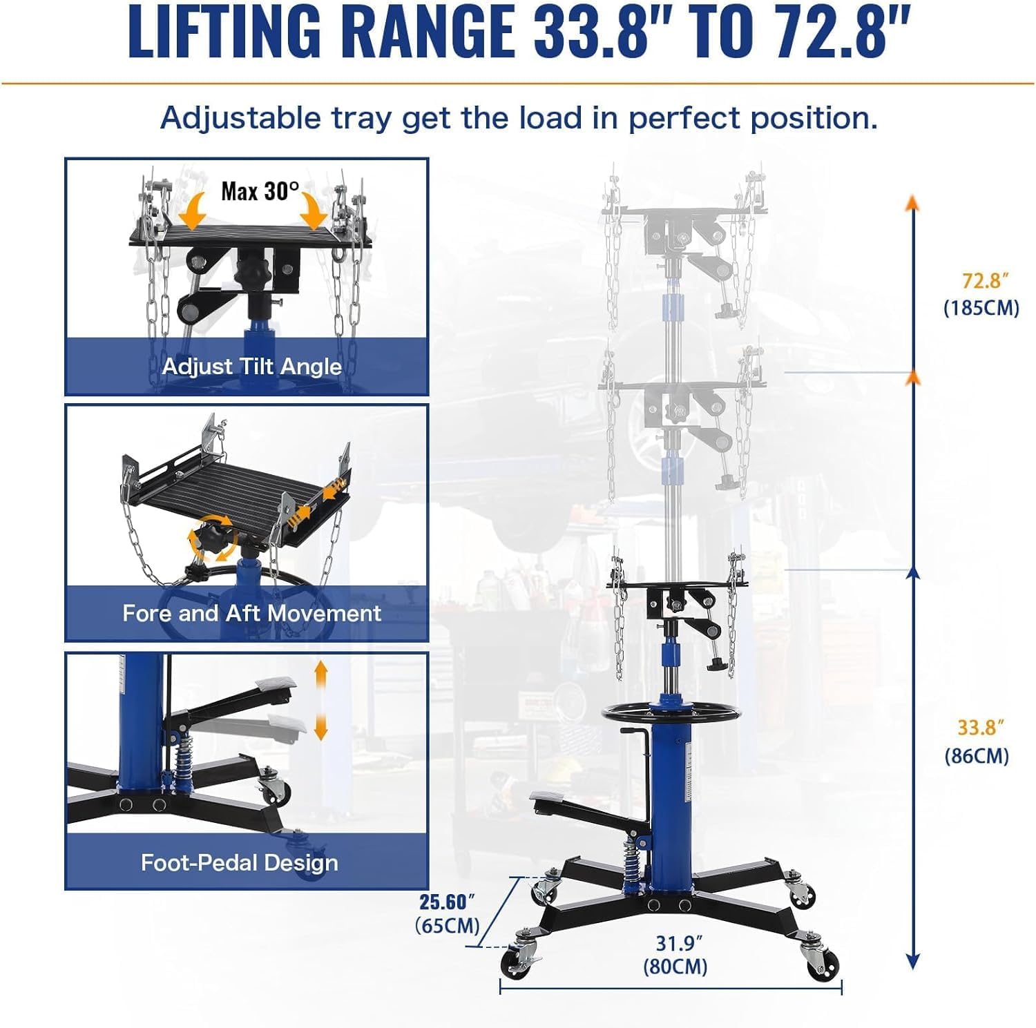 - Smooth Hydraulic Lifting & Adjustable Height:Easily adjust the jack height from 33.8" to 72.8" using the foot pedal for hands-free operation. The innovative 2-stage design boosts stability at maximum height, while the quick-release handle allows for controlled, smooth lowering. This transmission jack adapter-friendly model provides precise height control to fit different vehicle lifts and workspaces.