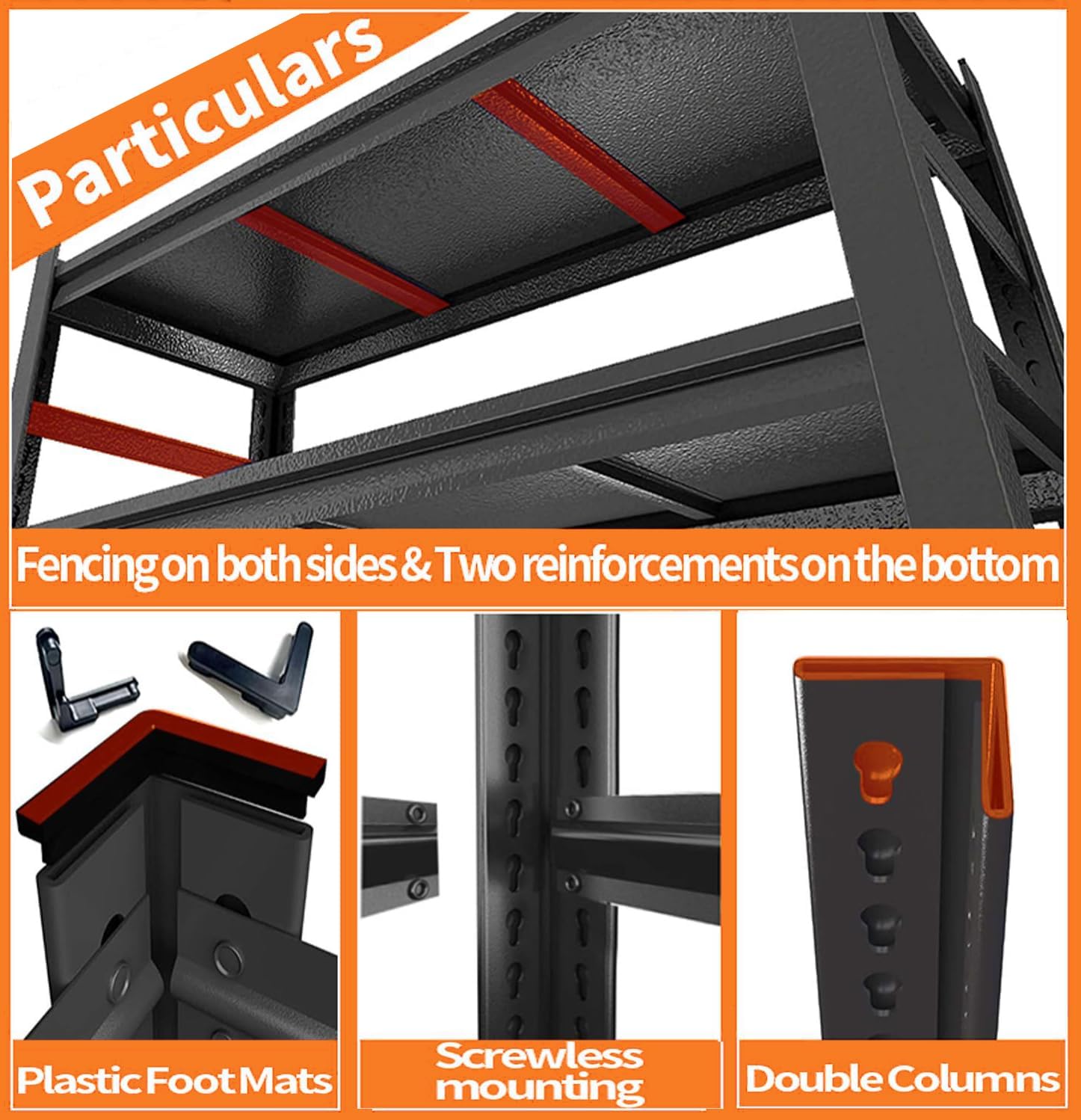 - ăThe double-layer column design provides enhanced stabilityăThis Storage Shelves features a double-reinforced column structure, with support ribs on each tier to enhance overall stability. Constructed with a high-strength steel frame and durable steel panel shelving, this 5-tier Shelving unit offers reliable load-bearing capacity and is suitable for safe storage of various items.