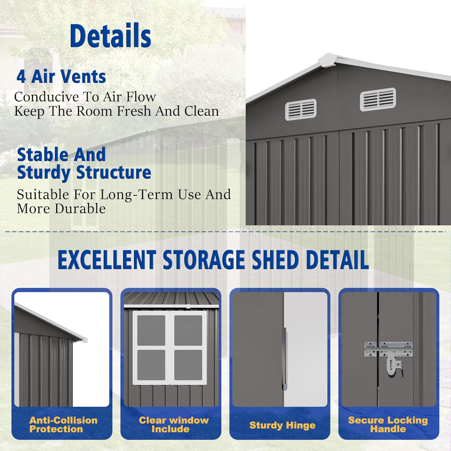 8X10 FT Outdoor Storage Shed with Window, Metal Sheds & Outdoor Storage with Lockable Door and 4 Vents, Outside Storage Shed Waterproof for Backyard, Garden, Patio, Gray