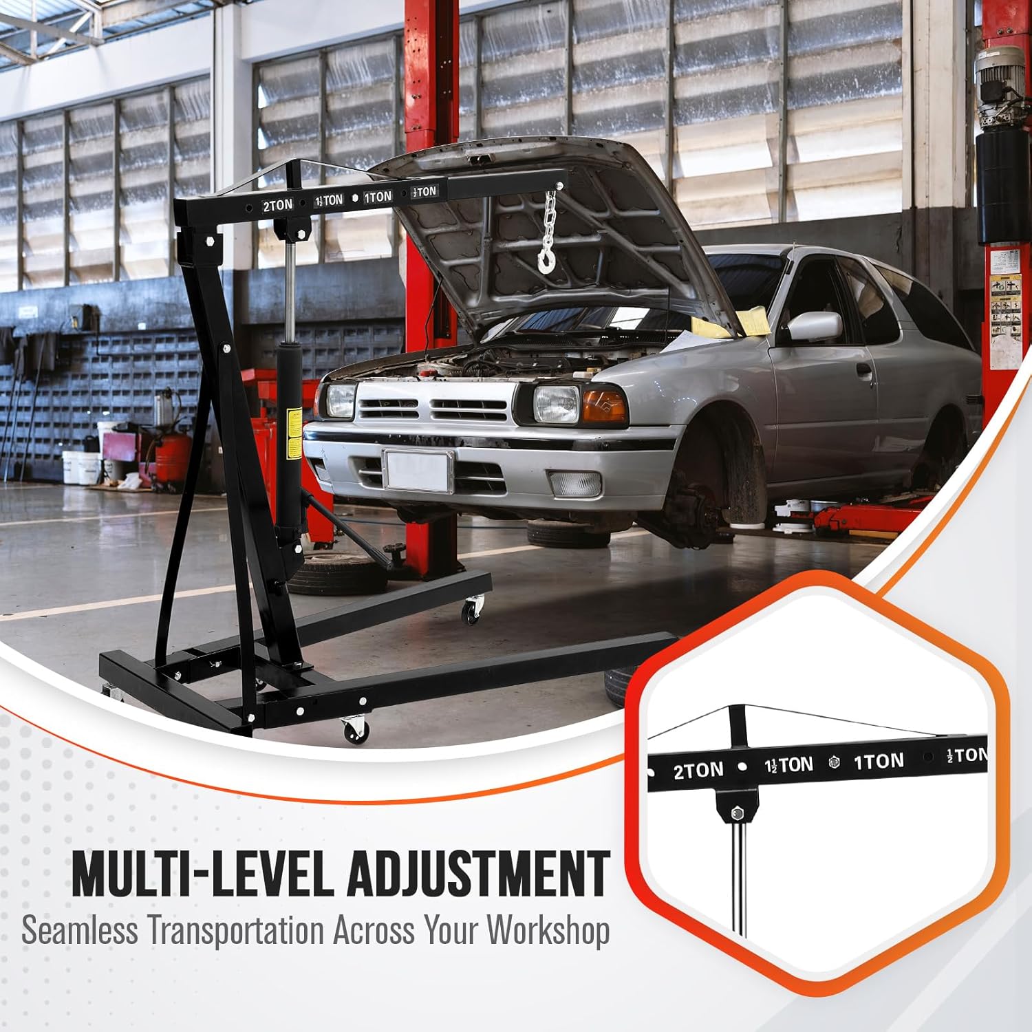 - HEAVY-DUTY LIFTING POWER: This hydraulic engine hoist, rated for 2 ton/4400 lbs, is engineered for heavy-duty lifting tasks. Suitable for engines, gearboxes, axles, and other substantial machinery, it serves as an indispensable multi-purpose tool for garages, warehouses, or auto repair